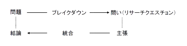 「問題」のフェーズでは、課題を見つけ、それをブレイクダウンして「問い(リサーチクエスチョン)」を立てました。その問いのそれぞれに対して根拠に支えられた主張ができているはずです。それら複数の主張を関連づけて統合し、問題に対する結論を導き出します。「主張」は「問い」に対する答え、「結論」は「問題」に対する答えであり、ブレイクダウンと統合は逆の関係にあります。