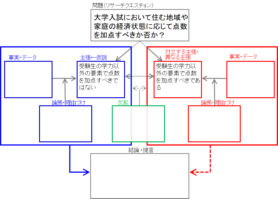 上の設問で、あなたの意見が「加点すべきだ」か「加点すべきでない」のどちらであったかにかかわらず、「加点すべきではない」と考える人の根拠(「事実・データ」と「論拠・理由づけ」)を、以下の資料Aを用いて対話型論証モデルにまとめてください。