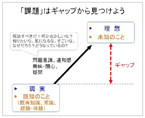 問題意識は、実生活や実社会を見つめる中で感じる現実と理想とのギャップ(ずれ・隔たり)から生まれます。ぜひ自分ごととして主体的に取り組める課題を見つけてください。