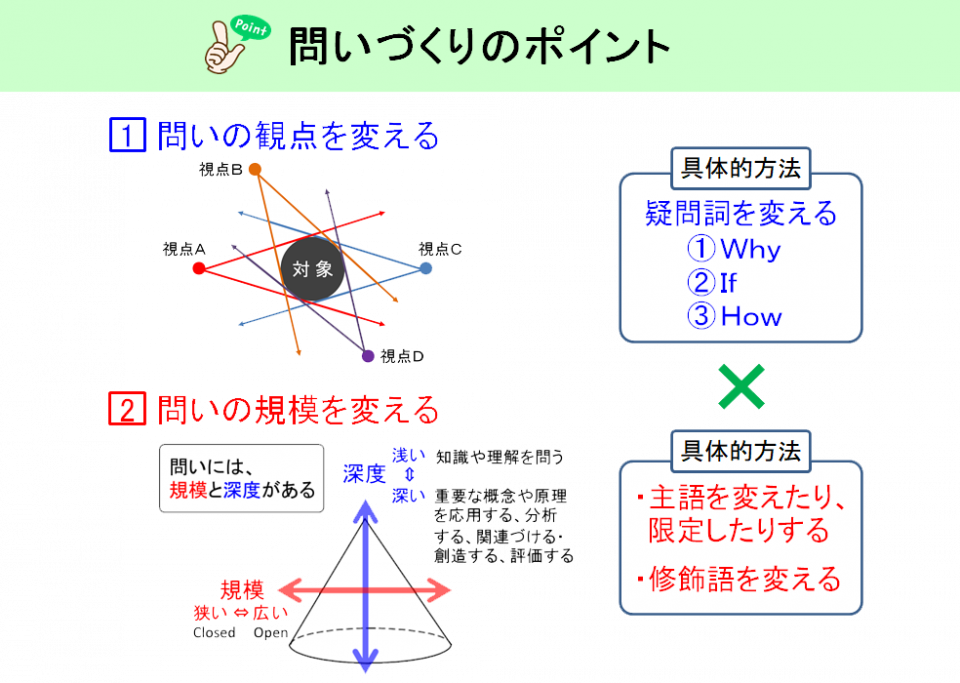 「問いの観点を変える」というのは、問いの視点を変える、あるいは、多角的に問い直すと言い換えられます(下の図参照)。その時、疑問詞5W1Hを変えてみてください。とくに、①Why?(なぜ?)、②If~(もし~だったら?)③How?(どうすれば?)を使って問い直すことで、問いによいバリエーションができます。