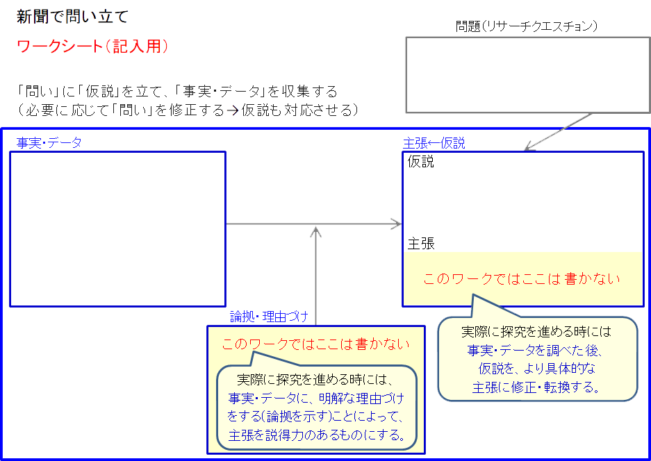 時事問題が凝縮されている新聞を使って「問い」を立てる練習しましょう。さらに、「課題の設定」と「情報の収集」を往還しながら仮説を検証していく、よりよい「問い」に練り上げるという過程を学びましょう。